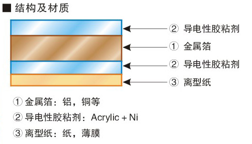 以金屬箔為主要基帶,涂上一層獨特的導電壓敏丙烯酸膠粘劑制成膠帶 ,提供離型紙,易于模切和使用。銅箔膠帶和鋁箔為基帶的膠帶使用最為廣泛,其中又分為單面與雙面膠帶。